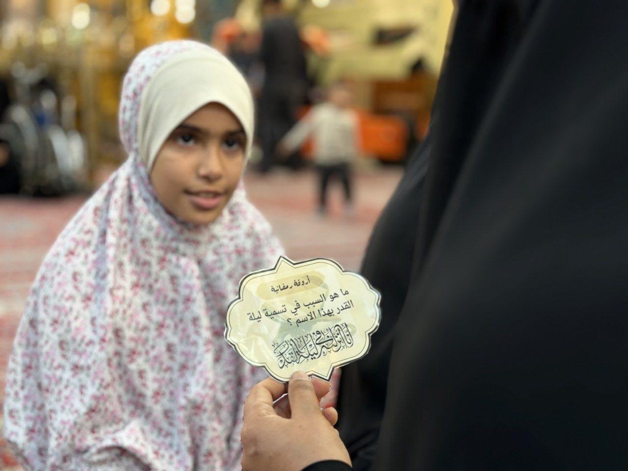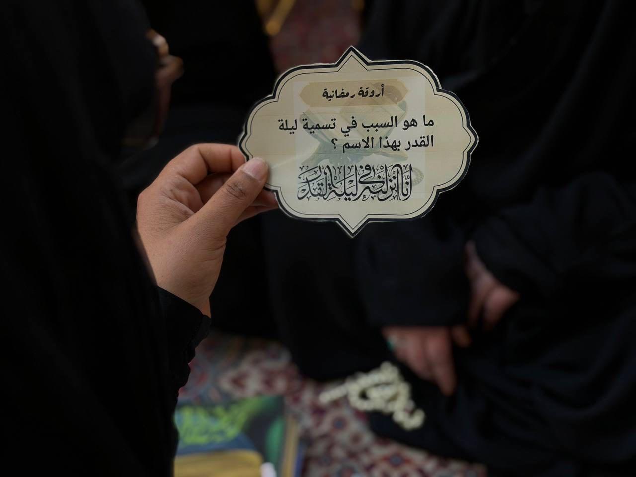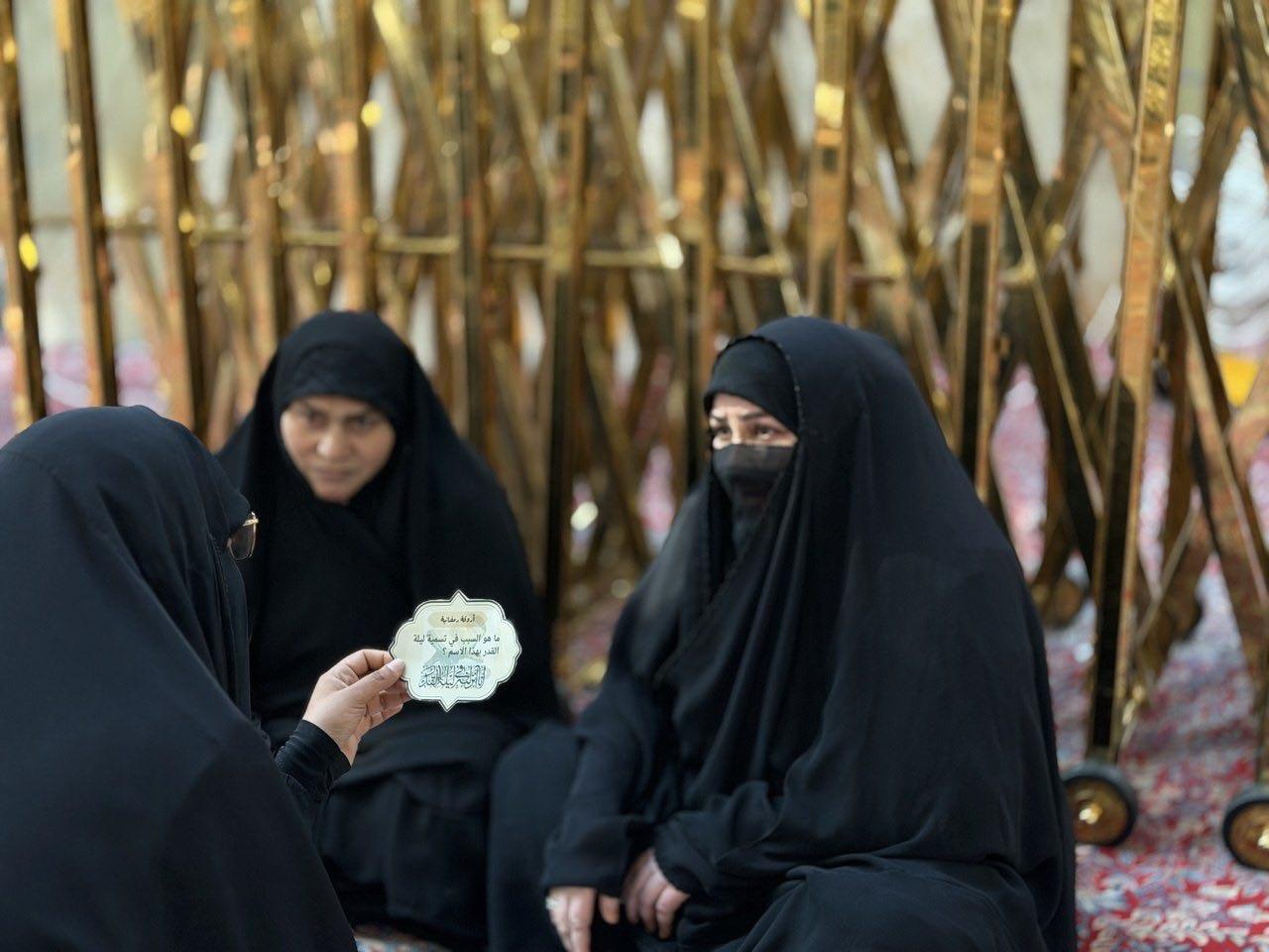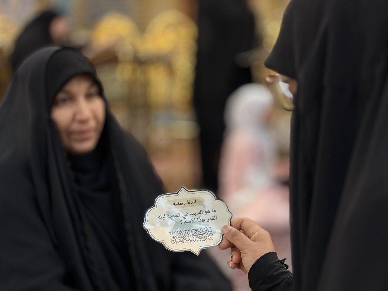 نظّمت شعبة التوجيه الديني التابعة لمكتب المتولي الشرعي للشؤون النسوية في العتبة العباسية المقدسة برنامجًا تفاعليًا بعنوان (أروقة رمضانية) للزائرات، وذلك في صحن المولى أبي الفضل العباس (عليه السلام)، تزامنًا مع حلول أولى ليالي القدر المباركة. وقالت مسؤولة الشعبة السيدة عذراء الشامي إن البرنامج يأتي ضمن سلسلة الأنشطة والبرامج المعدّة لإحياء ليالي القدر المباركة، إذ يتضمن فقرات تفاعلية مع الزائرات في الحرم المطهر، تهدف إلى بيان أهمية الجانب العبادي في هذه الليالي العظيمة، وشرح كيفية إحيائها وبيان فضلها، فضلًا عن التعريف بسبل اغتنام فيوضاتها المعنوية. وشهد البرنامج تفاعلًا ملحوظًا من قبل الزائرات، لاسيما في فقرات المسابقة الثقافية التي أسهمت في تشجيع المشاركات على التفاعل مع البرامج الدينية والثقافية التي تقدمها العتبة العباسية المقدسة، بما يعزز الوعي الديني والاجتماعي لدى النساء. وتسعى شعبة التوجيه الديني عبر هذه الأنشطة والبرامج التوعوية إلى توفير أجواء روحانية مميزة للزائرات خلال شهر رمضان المبارك.