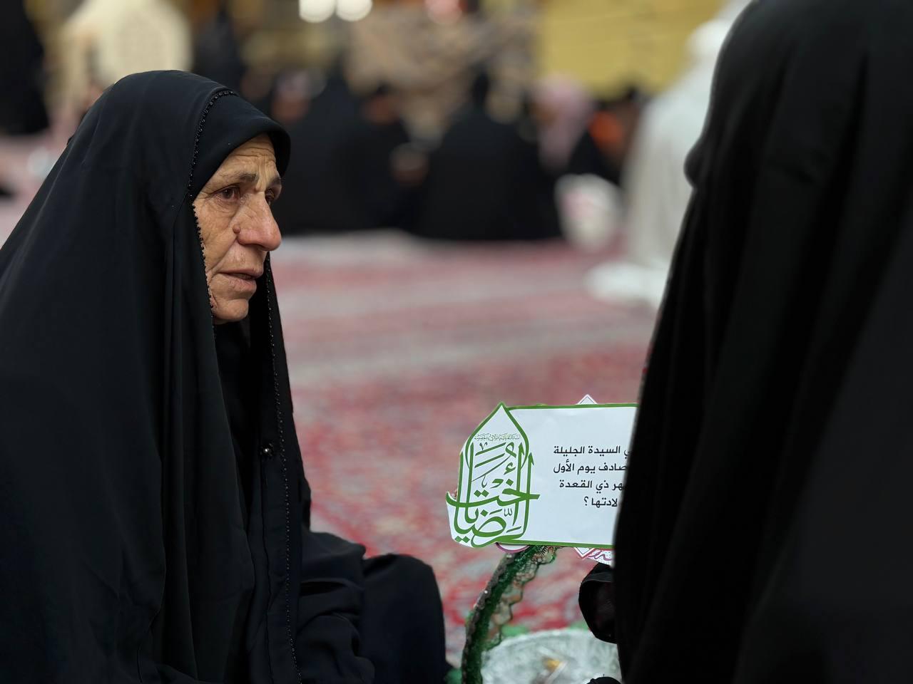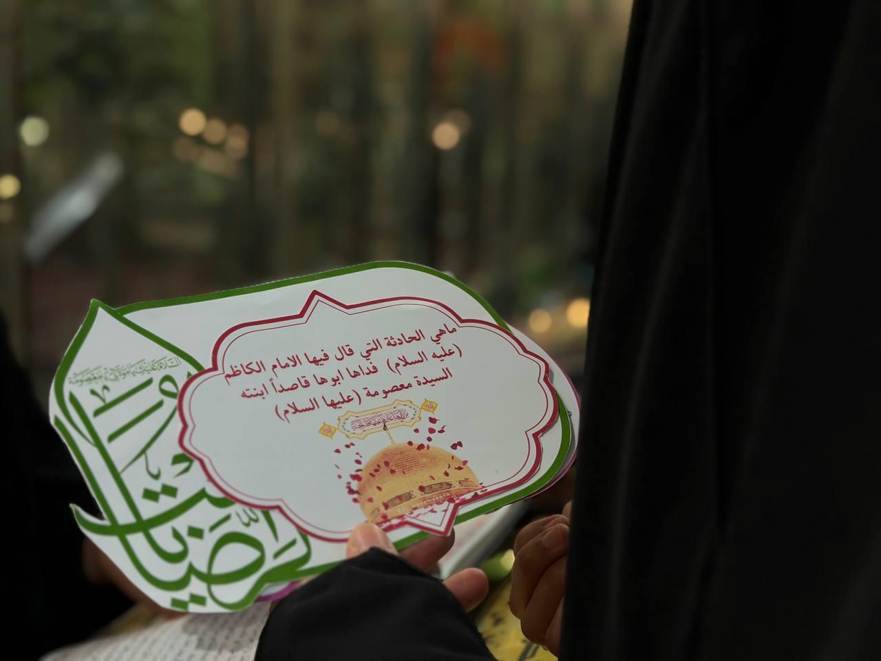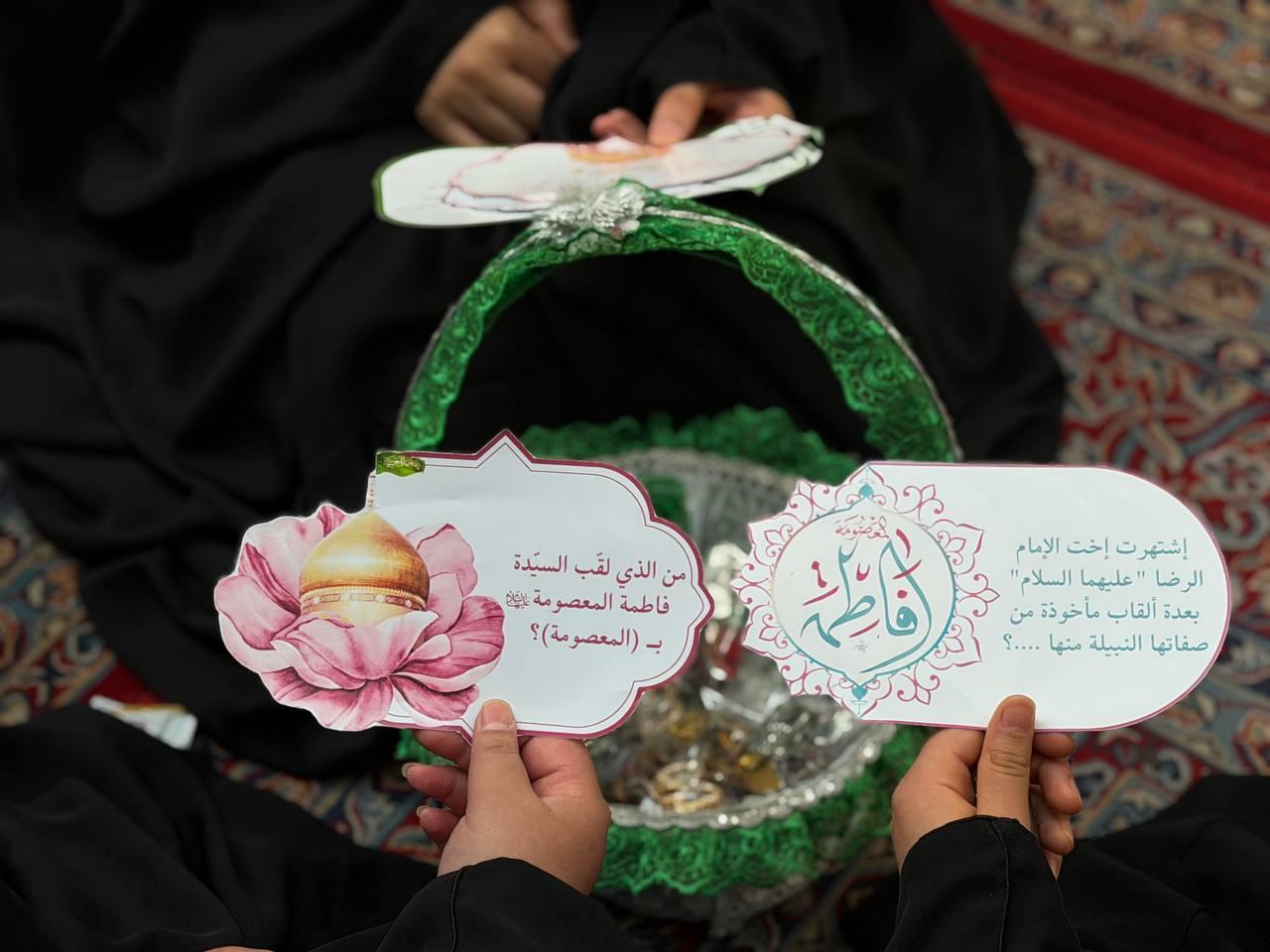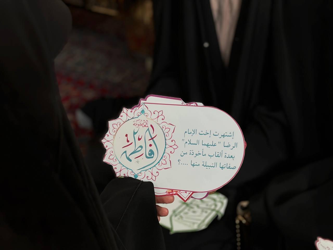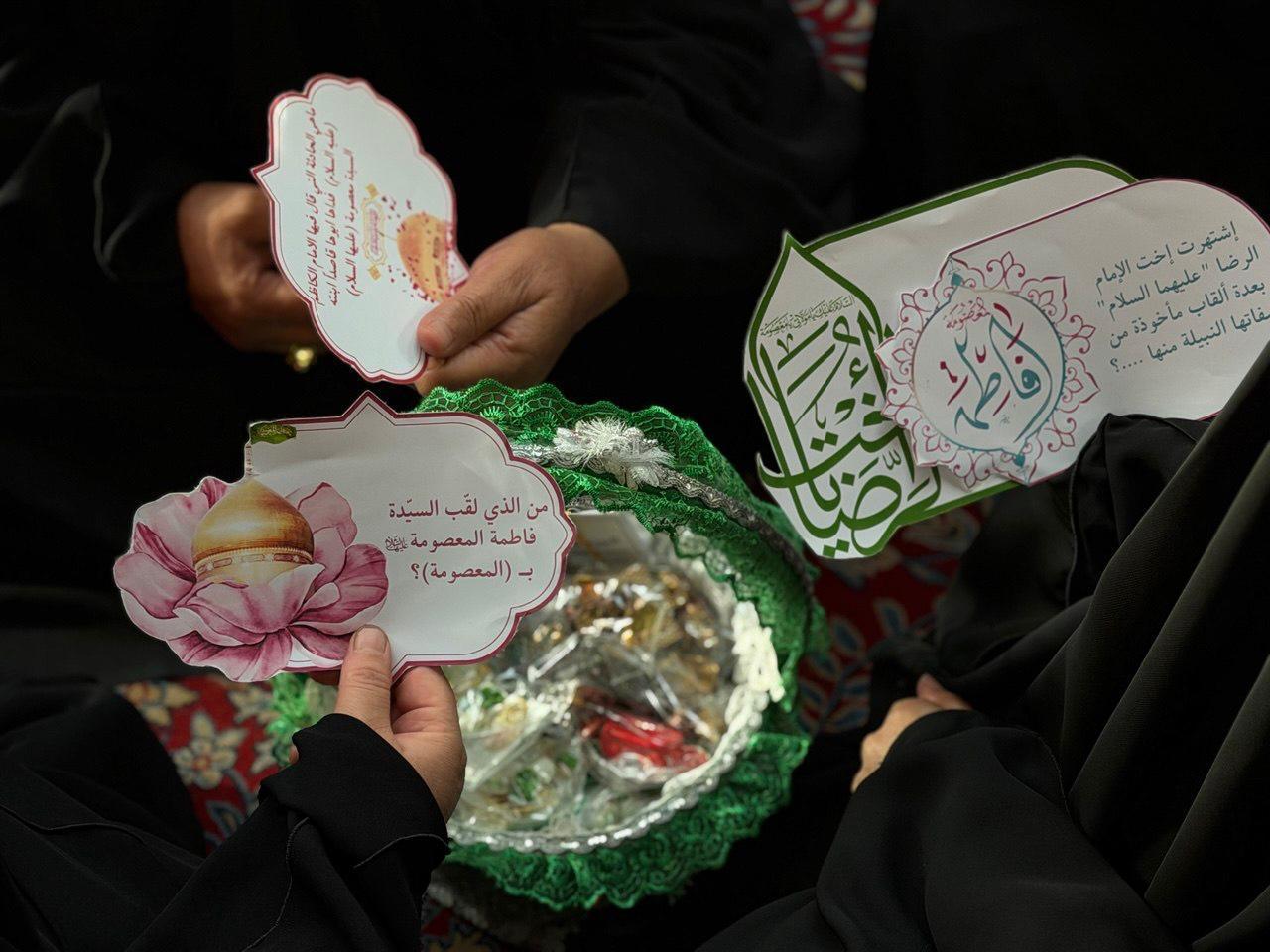 نظّمت شعبةُ التّوجيه الدّيني التابعة لمكتب المتولّي الشرعيّ للشؤون النسوية في العتبة العبّاسية المقدّسة، مسابقةً ثقافية للزائرات، إحياءً لذكرى ولادة السيدة فاطمة المعصومة (عليها السلام). وأوضحت مسؤولة الشعبة السيدة عذراء الشّامي، أن الشعبة تحرص على إحياء المناسبات الدينية، لما لها من أثر بالغ في نفوس المواليات لأهل البيت (عليهم السلام). وتهدف المسابقة إلى التعريف بسيرة السيدة فاطمة المعصومة (عليها السلام)، إذ تضمّنت أسئلة مرتبطة بمكانتها العلمية والروحية تجيب عنها زائرات مرقد أبي الفضل (عليه السلام) إحياءً لهذه المناسبة المباركة.